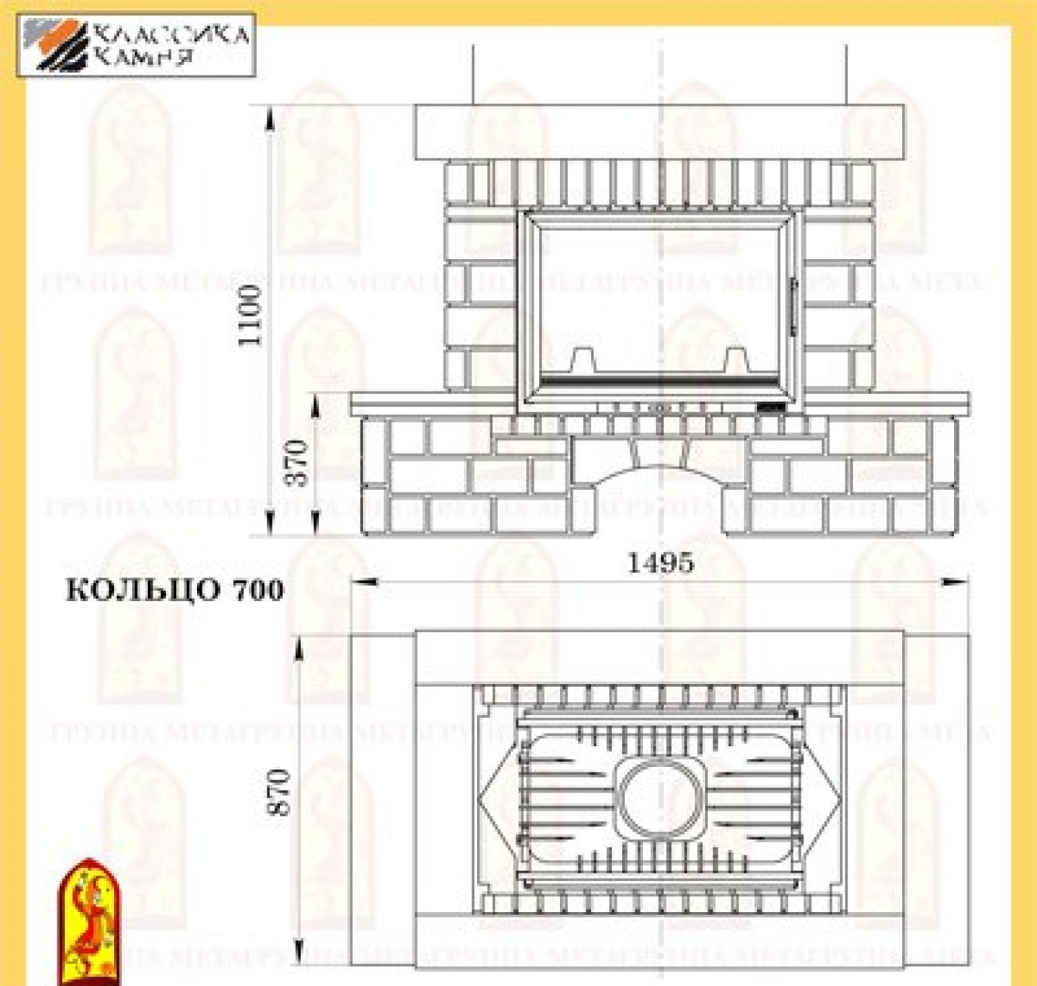 Облицовка Мета КОЛЬЦО 700 изготовлена из натурального мрамора теплого бежевого оттенка с обработкой искусственного старения в сочетании колотого доломита жёлтого цвета и травертина светло-коричневого цвета. Предтопочная и надтопочная часть выложена шамотом песочно-жёлтого цвета. Каминная балка изготовленная из МДФ и покрытая шпоном дуба, послужит отличной полкой для каминных аксессуаров. В нижней части камина расположена удобная ниша для хранения и сушки дров.